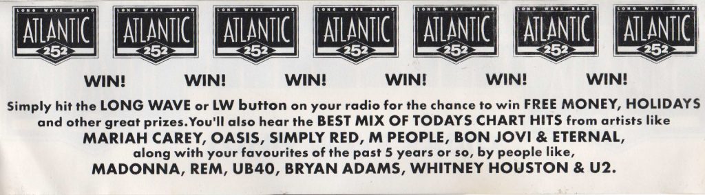 Welcome to Longwave Radio Atlantic 252! Playing you the biggest hits from today’s best bands, including Spice Girls, REM, Take That, Eternal, Oasis, Simply Red, Madonna, The Beautiful South and many, many more!